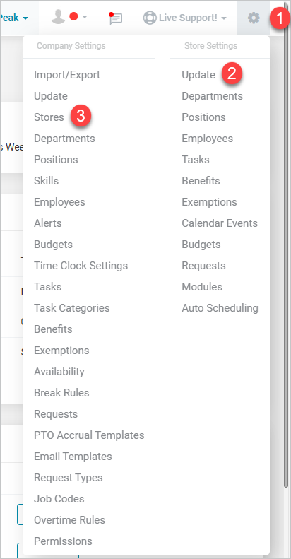 Select the settings menu and choose Update under the Store Settings. Or select Stores under Company Settings to access the store information. The Store Settings screen appears.