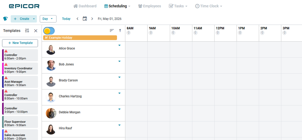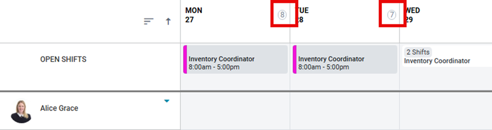 - A circle indicator under each date header shows the number of scheduled employees.