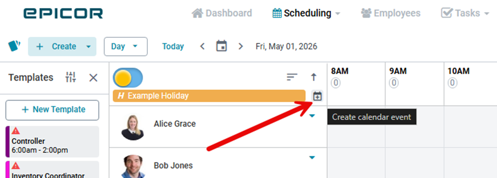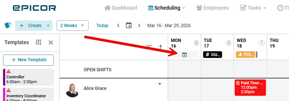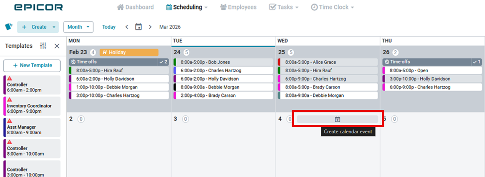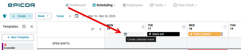 Scheduling+ allows you to create and manage calendar events directly from the Manage Schedule screen across Day, Week, 2 Weeks, and Month views.