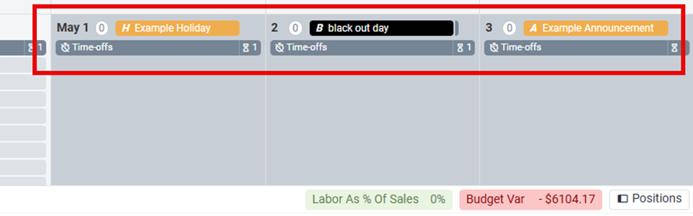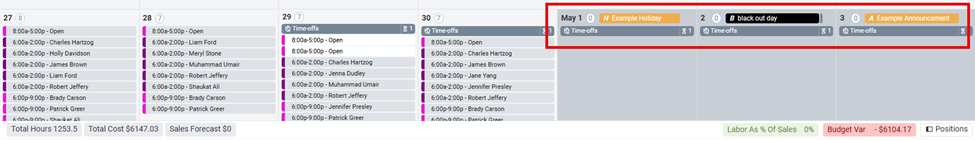 - If a Blackout Day is created, a black line appears under the shift tiles for that date.