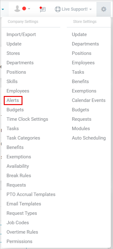 To receive alerts when an employee is reaching their overtime limit select Alerts from the Settings drop-down menu.