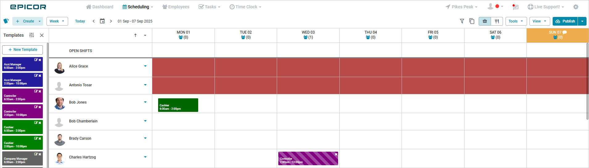 Once the copy mode is on, select and drag the copies of shifts into the desired shift block. If the employee is available, the shift is displayed in white, allowing you to assign the template. If the employee is unavailable, it turns maroon , preventing you from assigning the template.