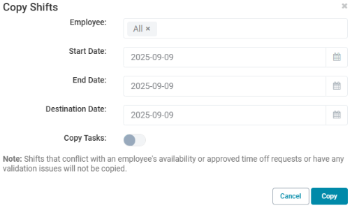 NOTE: If you use the task module and wish to also transfer over your employee's assigned tasks, please be sure to select Copy Tasks from the additional options. Please note that if an employee has approved time off the shifts will not transfer for days they are marked as unavailable.