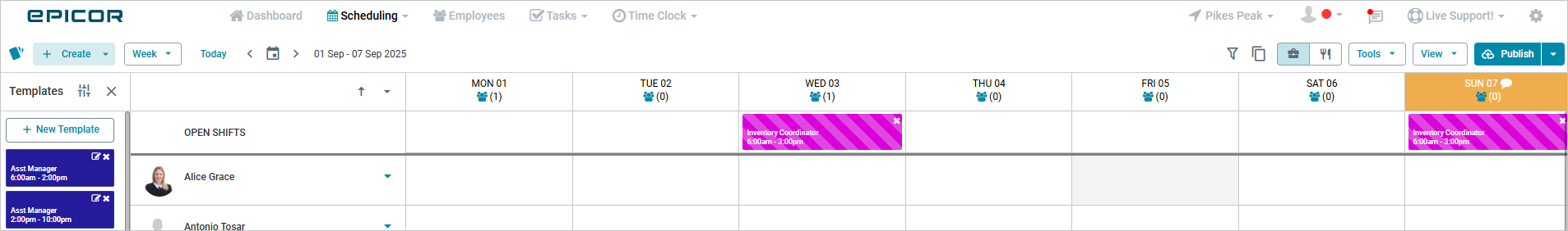 - Select Save. The newly created open shift appears in the OPEN SHIFT row of the schedule.